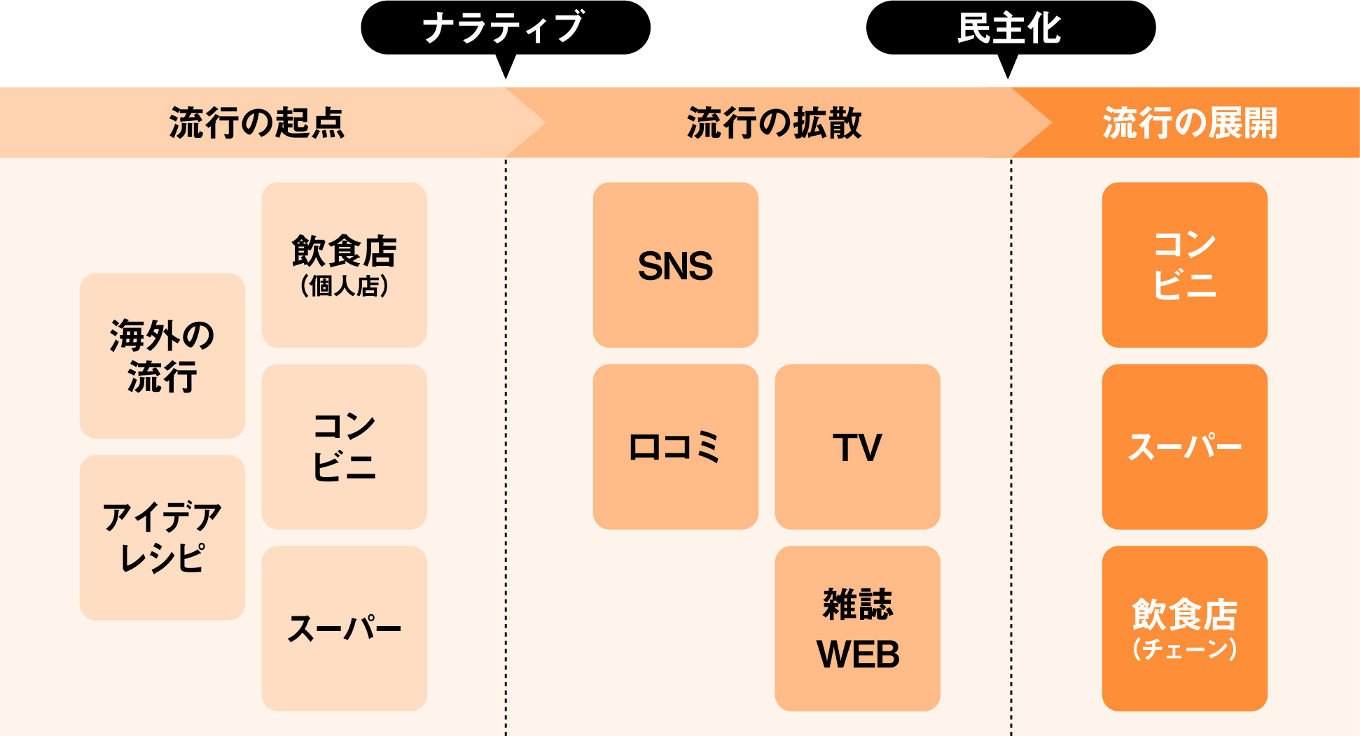 食のトレンドは、多くの場合「外食」から生まれます。特に情報感度の高い生活者が集まる飲食店では、新しい食材や調理法を取り入れた先進的なメニューがいち早く登場します。それがSNSなどを通じて広まり、テレビやネットメディアで紹介されることで一気に注目されるという流れが一般的です。その後、コンビニやスーパーといった小売の売場に商品が並び、誰もが手に取れる状態になった段階で、いわゆる“民主化”が進み、トレンドは定着へと向かいます。