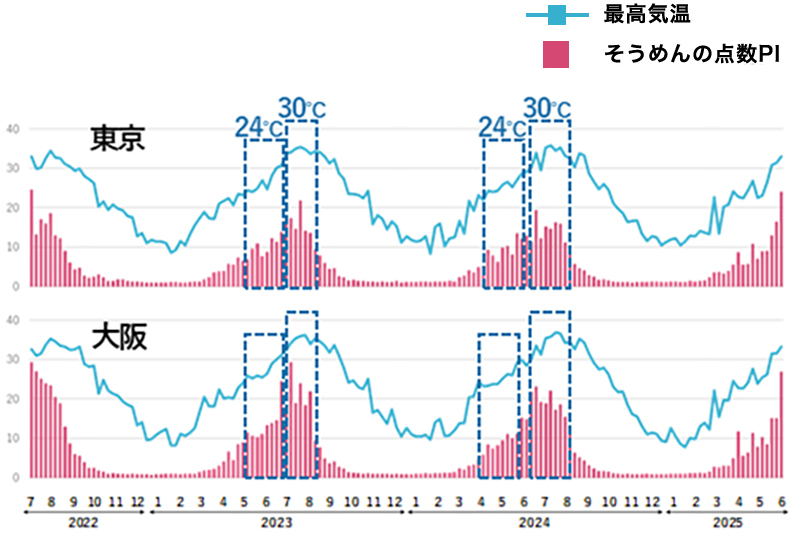 ここでは、東京・大阪を対象に、最高気温と「そうめん」の購買(点数PI)の関係を分析しました。「そうめん(乾麺)」に焦点を当て、1週間ごとの平均最高気温(折れ線)と点数PI(縦棒)をグラフ化しています。