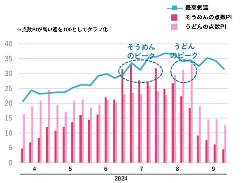 6月から7月にかけてピークを迎えた一方、そうめんの売上が落ちる8月後半には「うどん(乾麺)」の売上がピークを迎え、冷たい麺を求める需要がうどんへと移行していることが見てとれます。